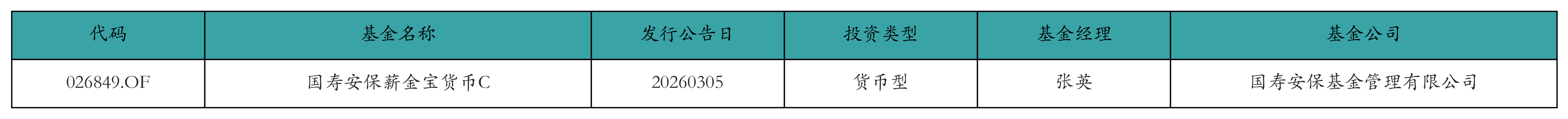 上周有1只新基金发行,分别为:国寿安保薪金宝货币C,详情见下表: